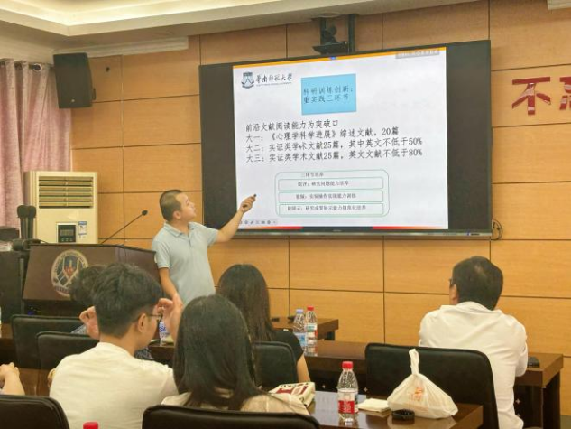 首先,周可教授就我院举办本次交流会表示感谢。王瑞明副院长对北京师范大学心理学部心理学拔尖基地老师和学生的到来表示热情欢迎。王瑞明副院长还回顾了两校心理学科悠久的交往情谊,对华南师范大学心理学科做了简要介绍,欢迎北京师范大学心理学部心理学拔尖基地老师和学生常来交流。随后,周可教授和黄健副教授分别分享了两校心理学拔尖学生的培养方案与经验。最后,来自两校的5位同学汇报分享了近期的研究发现和研究想法,并和双方老师和学生做了热烈的讨论。
