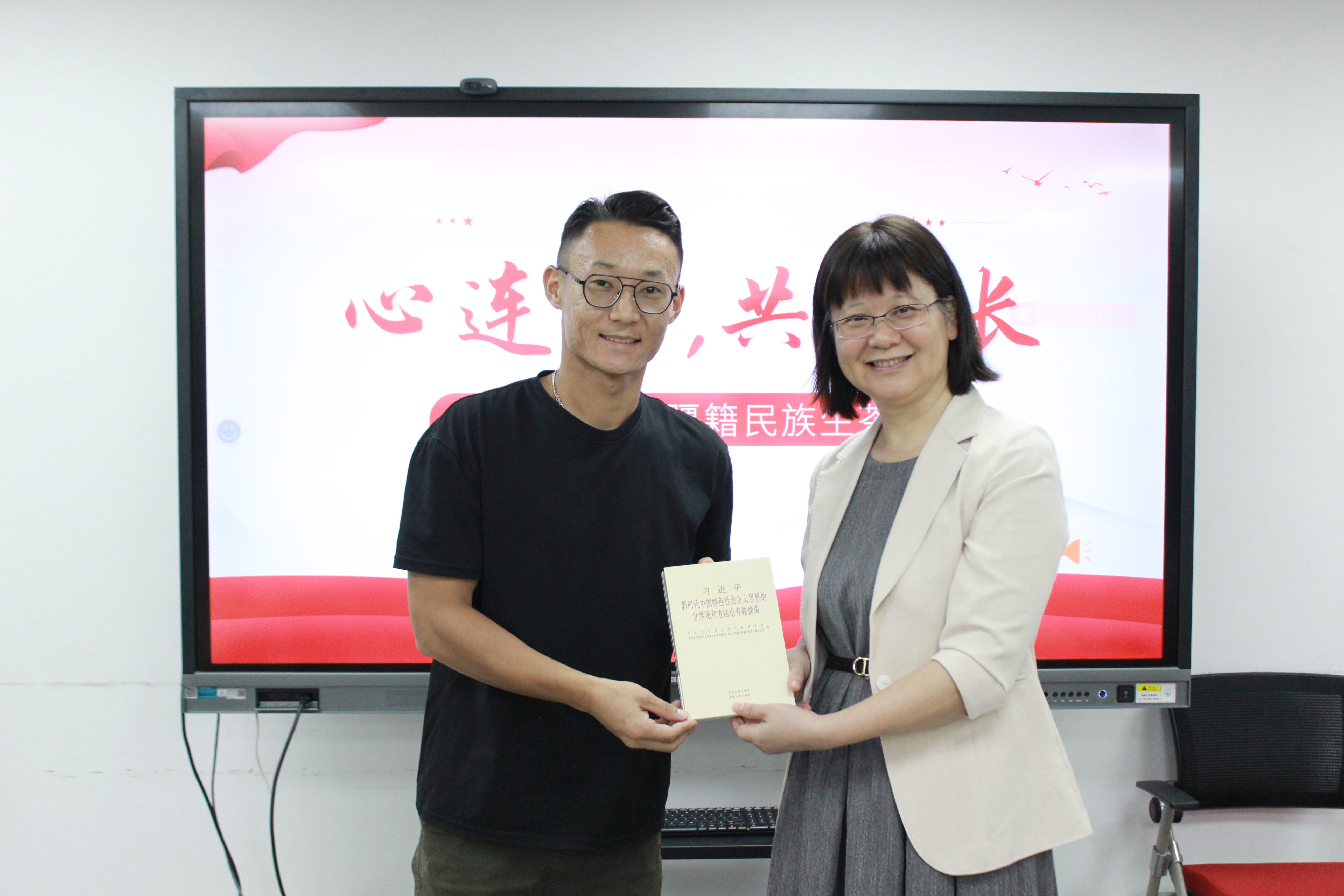 刘冬梅书记赠书并致辞。她为同学们送上《习近平新时代中国特色社会主义思想的世界观和方法论专题摘编》与《活出生命的意义》两本书,并勉励大家永葆爱国之心,在阅读与思考中不断成长。紧接着,25级新生阿吉古丽・阿不来提带来了新疆维吾尔族舞蹈展示。翩跹舞姿中流淌的民族风情,生动诠释了“各民族像石榴籽一样紧紧相拥”的深意。