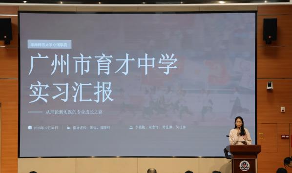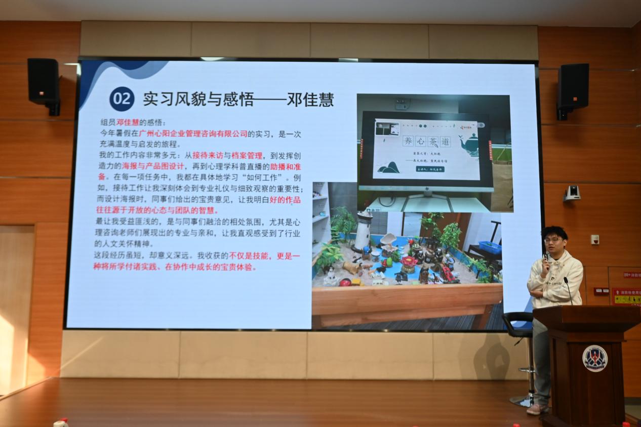 大会伊始,来自不同实习单位和专业方向的学生代表依次上台汇报。在心理学(师范)专业实习汇报环节,广州市增城区凤凰城中英文学校实习队、广州市育才中学实习队、佛山市禅城区南庄镇吉利中学实习队,分别分享了在中学心理健康教学、班级管理、团辅活动组织等方面的实践经历。同学们不仅完成了累计超百节的心理健康授课任务,还积极参与心理测评、个案咨询、校运会安保等多项工作,深刻体悟 “以生为本、以心育人” 的教育理念——在与学生的相处中学会包容与倾听,在课堂设计中实现教学相长。