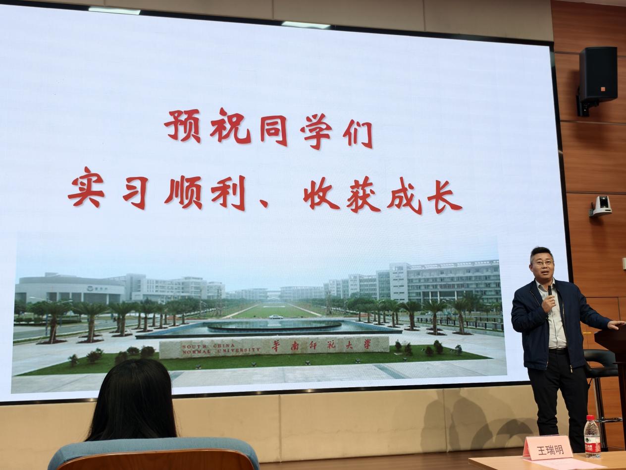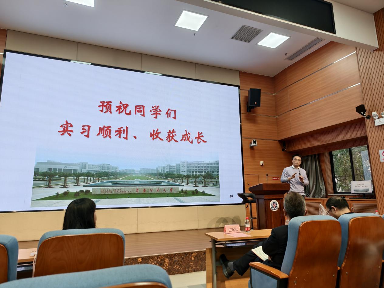 会议开始,王瑞明副院长代表学院致辞。他首先向为实习工作付出辛勤努力的指导老师、辅导员及行政老师表达了诚挚的感谢。王院长强调,教育实习是师范生培养的关键环节,是同学们从学生向教师角色转变的重要桥梁。他结合自身早年丰富的教学经历,阐述了实习对于锤炼教育教学技能、深化立德树人理念的不可替代作用。王院长指出,实习不仅锻炼“教书”的本领,更磨砺“育人”的初心,希望同学们在实习中深刻体会教师的责任与使命,为未来投身教育事业、培养社会主义建设者和接班人奠定坚实基础。他勉励即将奔赴不同地区实习的同学,无论是前往珠三角还是粤东西北,都要珍惜机会,积极思考如何将先进经验与当地实际相结合,实现自我成长与服务社会的统一。