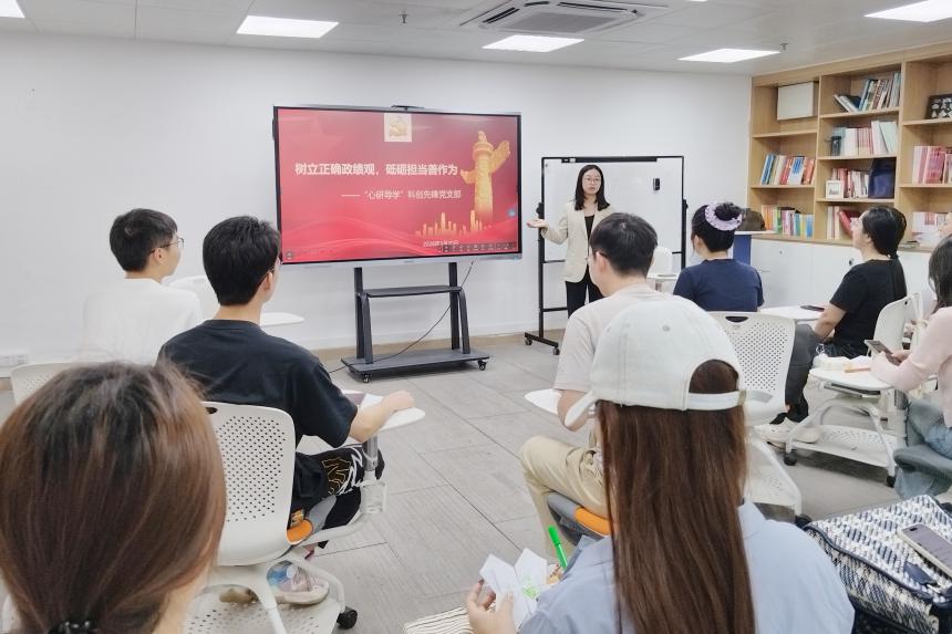 活动伊始,李佩婷从党支部组建背景、组织架构、性质定位、活动规划等方面对“心研导学”科创先锋党支部作了全面介绍。党支部旨在打破专业壁垒和学段隔阂,探索党建工作与科研创新有效结合的新途径。随后,全体党员深入学习习近平总书记关于树立和践行正确政绩观的重要论述,会议强调要筑牢思想根基、强化实干担当。